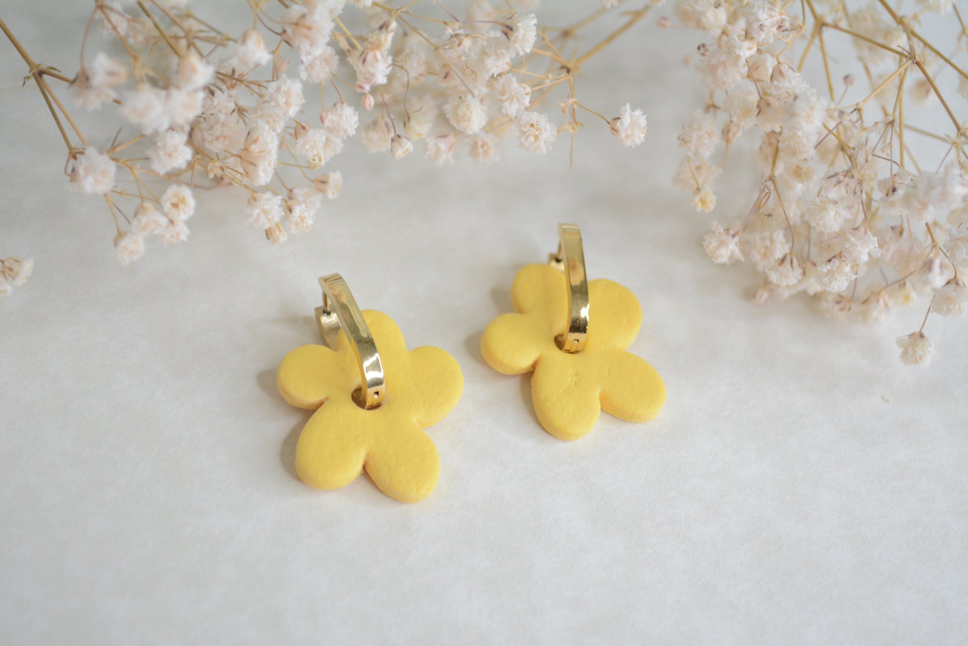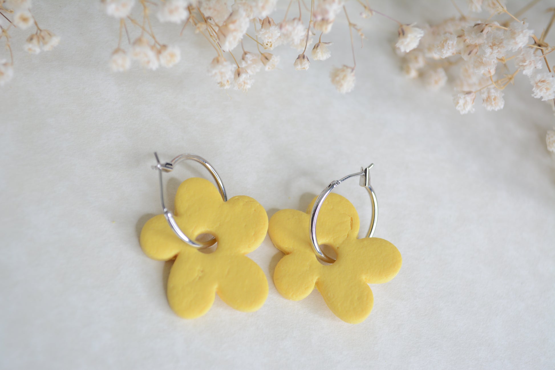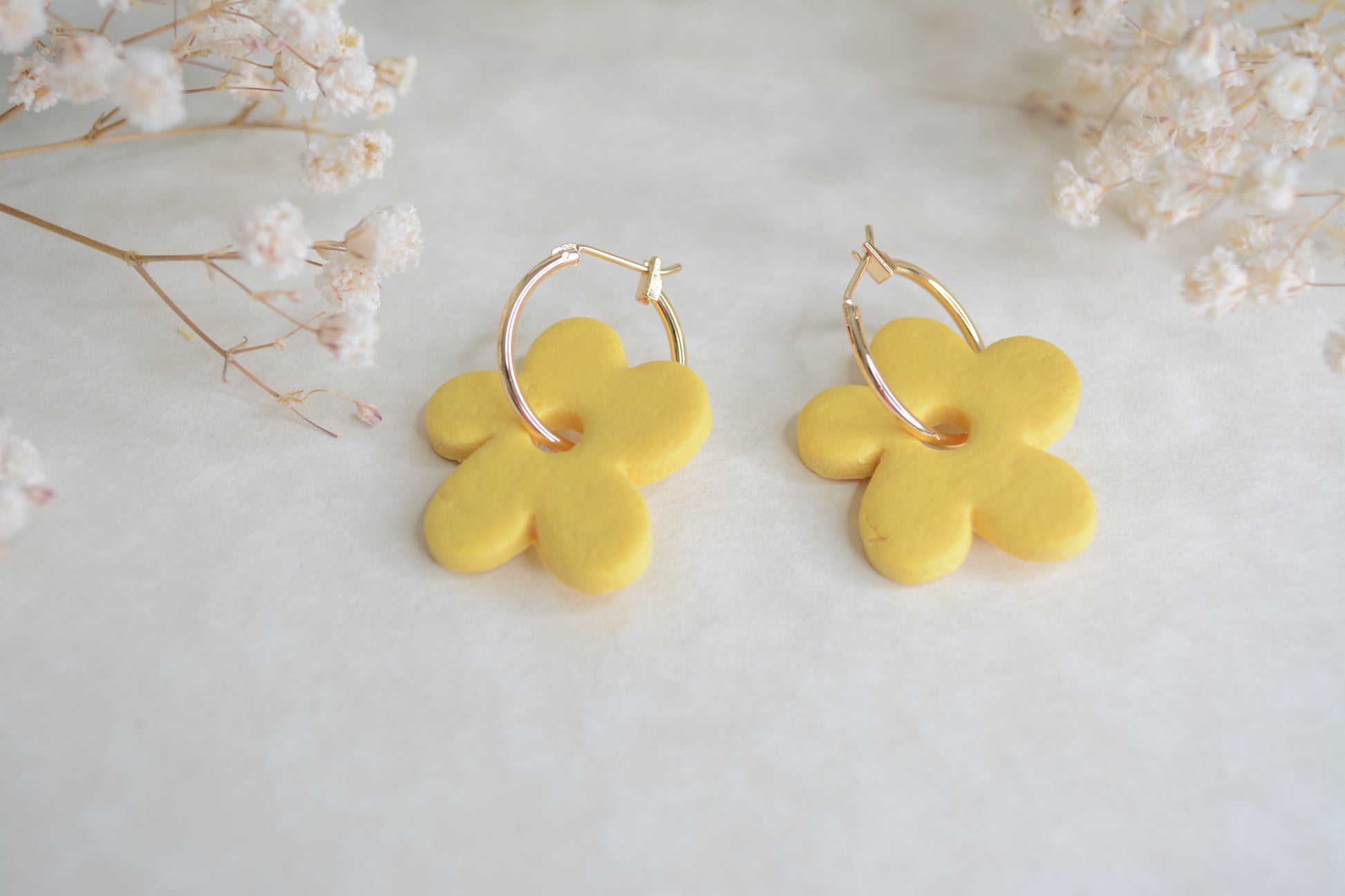 - Handmade earrings made with polymer clay, perfect shape of a flower. The magic of this earrings is that you can use just de Gold or silver hoop or use another type design with the hoops.