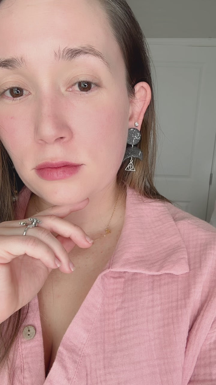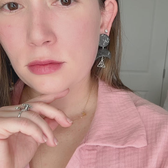 These Harry Potter earrings feature a timeless black polymer clay base, detailed in silver, with a signature silver pendant of the Deathly Hallows symbol. Show off your fandom in style!