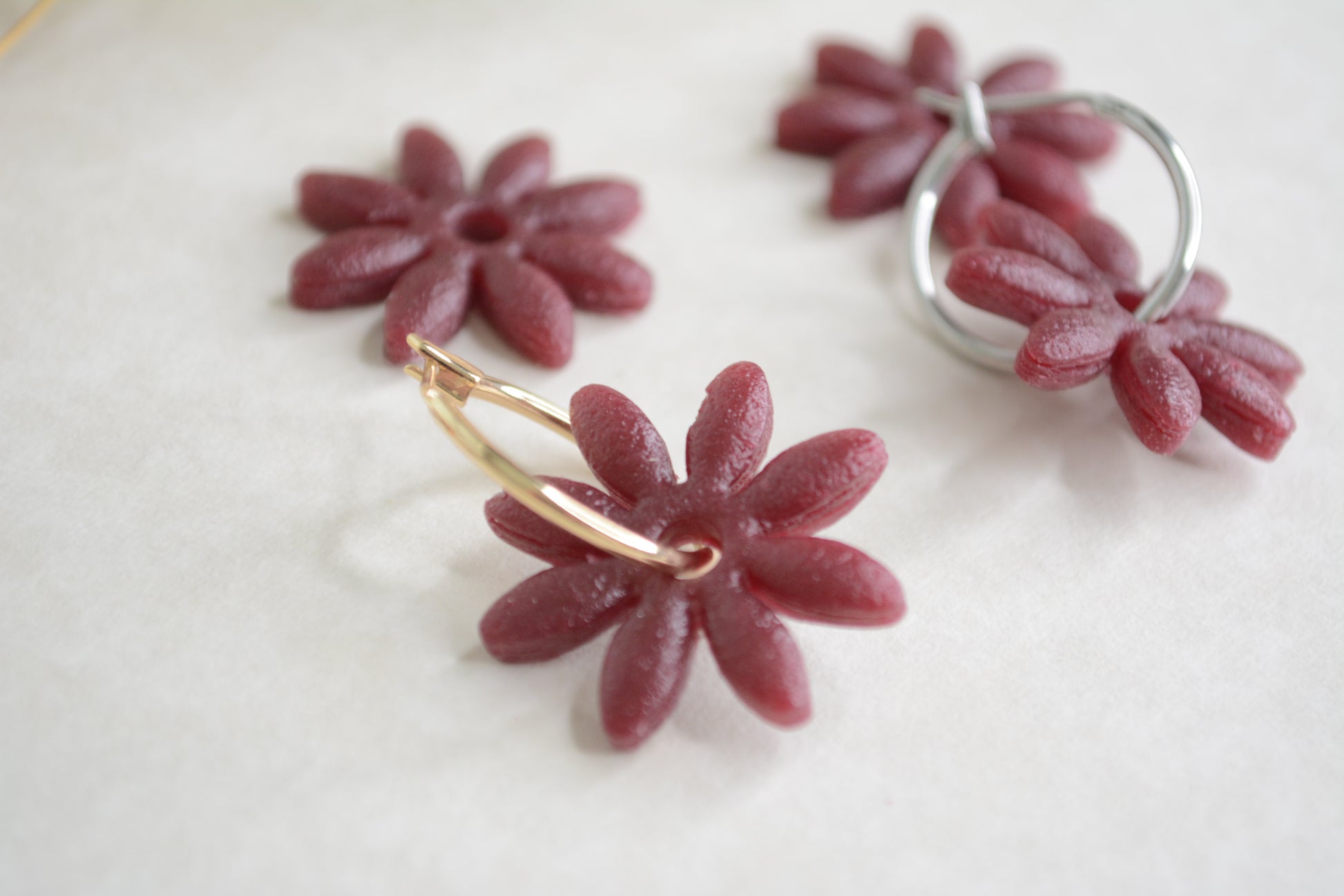 - Handmade earrings made with polymer clay, perfect shape of a flower. The magic of this earrings is that you can use just de Gold or silver hoop or use another type design with the hoops.