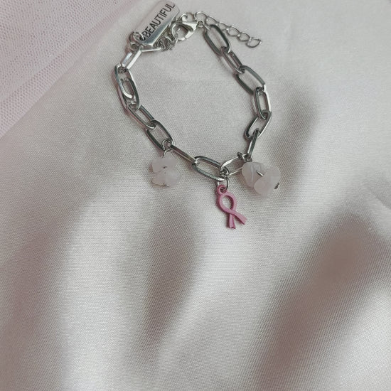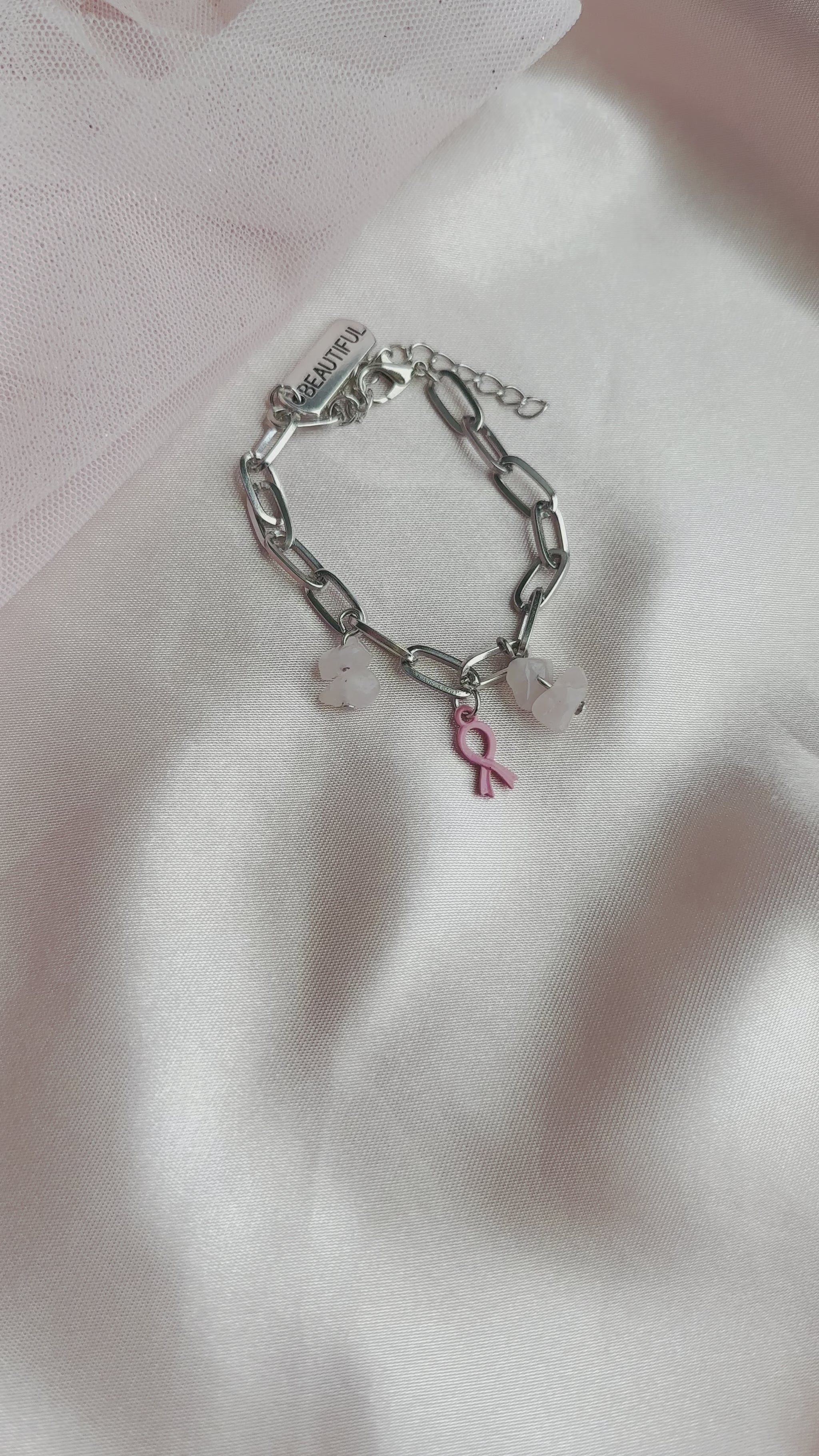 it's a silver chain bracelet lobster clasps with pink ribbon charms and pink rocks.