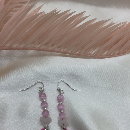 Pink beads, light pink stone and a pink ribbon.
