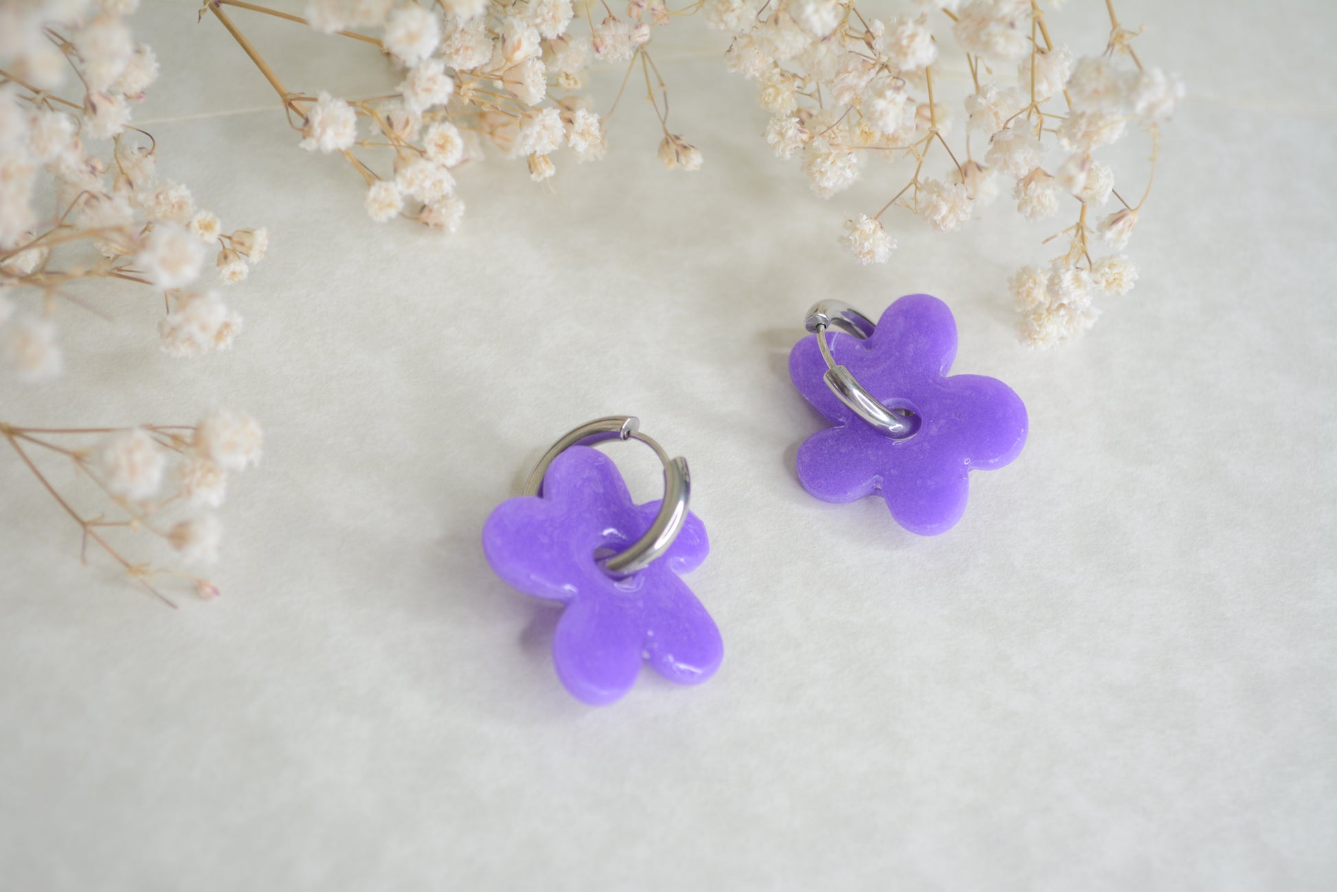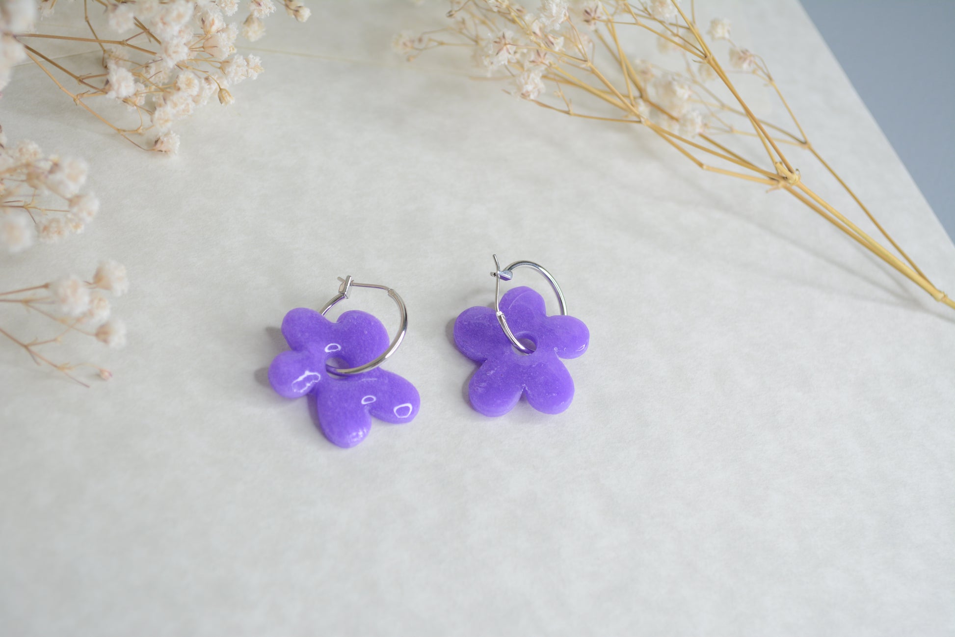- Handmade earrings made with polymer clay, perfect shape of a flower. The magic of this earrings is that you can use just de Gold or silver hoop or use another type design with the hoops.